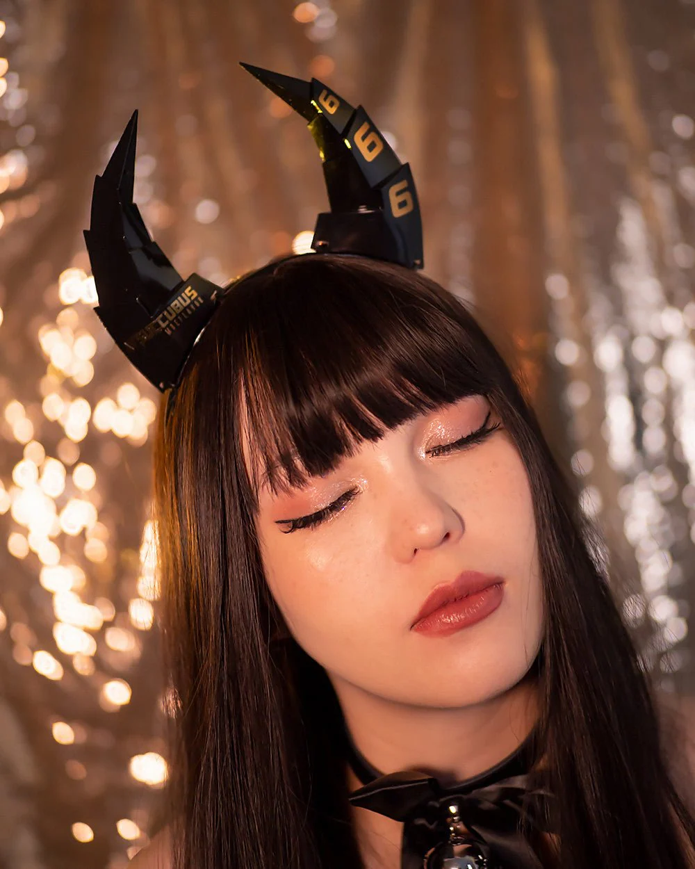 Unveil a bold look with our Cyber Succubus Headband, showcasing two sleek, cyberpunk horns. One horn features the number 666 for a devilish flair. Crafted from gold metallic ABS plastic, this headpiece is both eye-catching and durable.