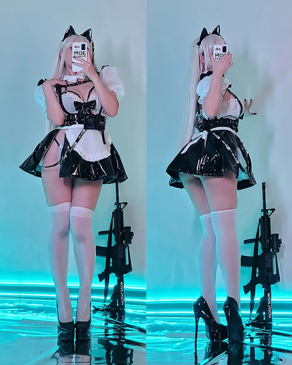 Experience the perfect fusion of traditional and modern with our Tactical Maid dress. The vinyl skirt stands out with its practical straps and pockets, providing a tactical edge and cyberpunk flair. The chiffon top, with its puffy sleeves, enhances the classic maid appeal, while the vinyl triangle bikini top underneath offers a hint of boldness. This ensemble is ideal for those who seek to make a statement with a blend of elegance and innovation.